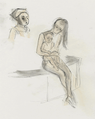 I first meet Maria very late one evening, just after I had drawn Pavel the kind homeless man with his dog. She is breast feeding a baby, and I sit on the bench beside her to draw her.