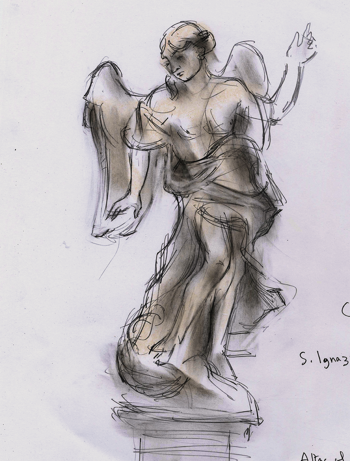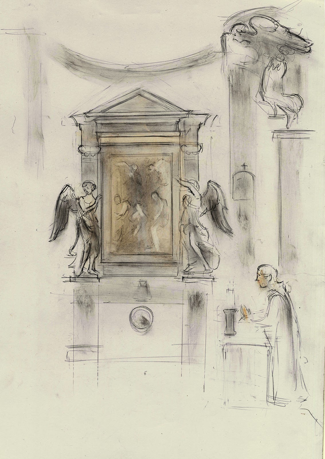 The acoustics in the large Italian churches, the music which sometimes includes arias from Verdi and the lovely style of the Italians clothes make these services a favourite subject for my drawings, and so it was that I crept into the back of the church to make a drawing of the service.