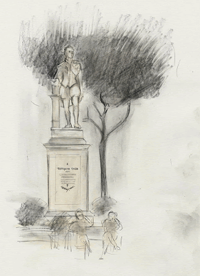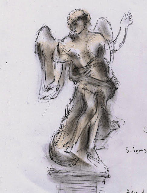 This is the first drawing trip since covid scourged us six years ago. I knew my first drawings would be tight and tentative, so I chose to draw something safe like a lion in front of Massimo Theatre