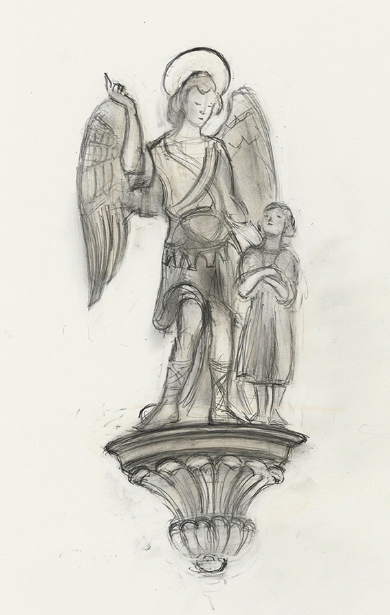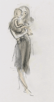 Mothers with their children have long been a favourite subject for my drawing. Late one evening I met this lovely child, Angela, serving lasagne with her mother. Angela is coy and clings to her mother's apron.